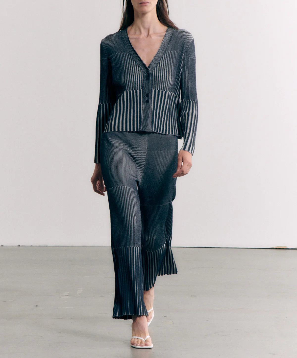 It’s knitted with a ‘vanished’ or ‘disappearing’ knit pattern where two colours–navy and ecru–are combined in a textural, vertical stripe pattern. As your eye moves down the silhouette, the stripes get wider, creating the illusion of a gradient of colour. It’s shaped to softly nip in at the waist before finishing at a hip-skimming hem.
